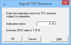 You can update the Federal amounts automatically by using the Update TD1 button on the Employees tab. For 2016, the Federal Indexation Factor is 1.013. Select all the employees and then click on the TD1 button.