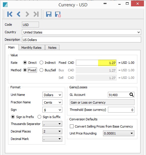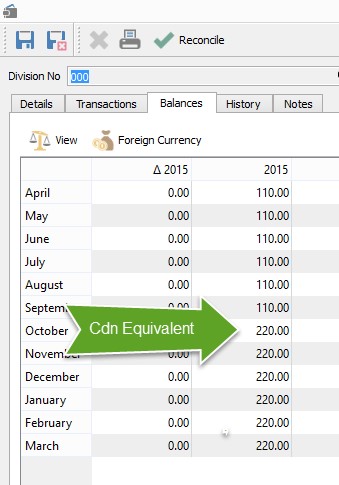 For current transactions, the system uses the current exchange rate to record the Canadian equivalent; for transactions in a prior period, the system uses the rate for that period. If a rate has not been entered, it uses the current rate. Users can also set the exchange rate for specific transactions.
