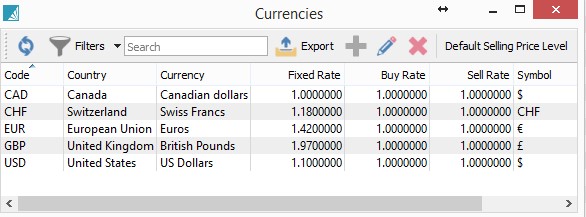 - Edit/Currencies where, for each currency, the currency is configured, the current exchange rate is established, as well as rates for each prior month