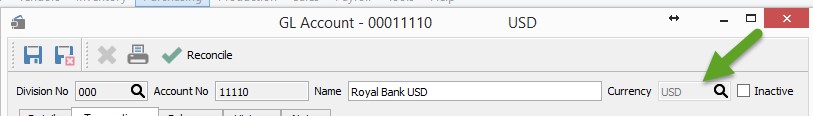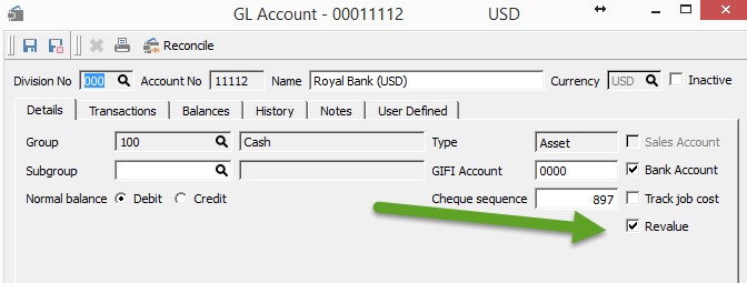 Bank accounts, Accounts Receivable, Accounts Payable and other monetary accounts (US GIC’s, perhaps) should be flagged as ‘Revalue’. All income statement accounts as well as capital asset accounts should not be so flagged. Note that inventory is only maintained in Canadian dollars even though inventory vendors might be from the US or elsewhere.