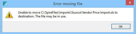 If your only crime was to have your spreadsheet open in Excel while you were importing, you will get the message below, but the import will have been successful. In that case, your spreadsheet will still be in your ‘source’ sub-directory. You might also choose to leave the Excel spreadsheet open on purpose so that Spire does NOT move it.