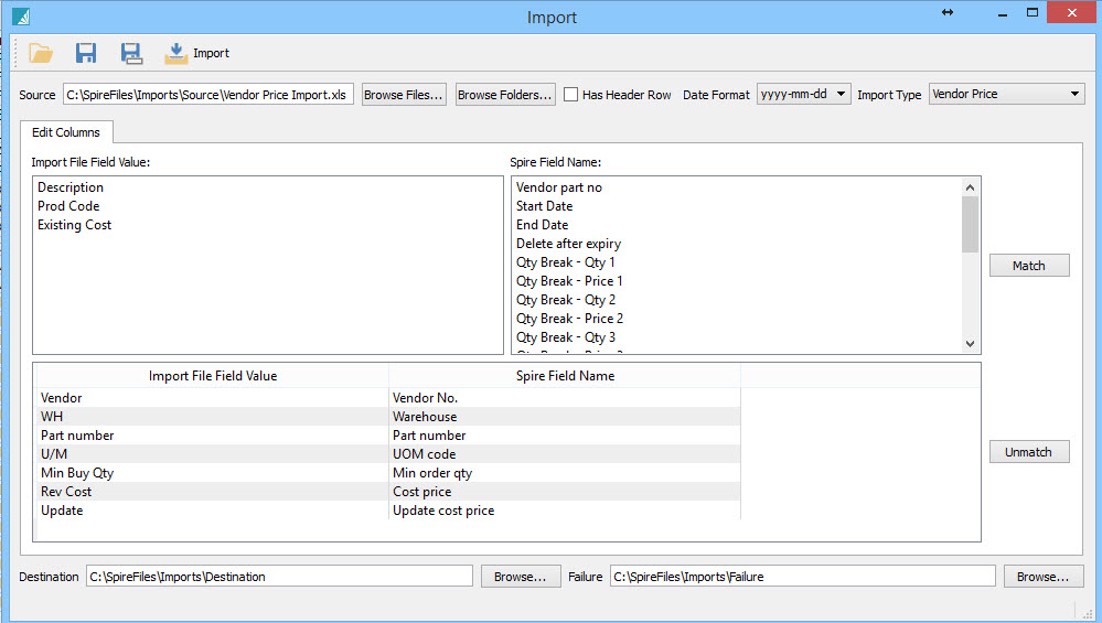 Spire has a built-in utility to import data, which is important for a multitude of uses, such as updating customer or vendor pricing. Importing must be done very carefully however, since it can also wreak havoc in your Spire data. It is typically done from an Excel spreadsheet.