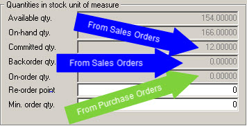 The inventory screen in BV shows the committed and back order quantities of Sales Orders, as well as the quantity on Purchase Order.