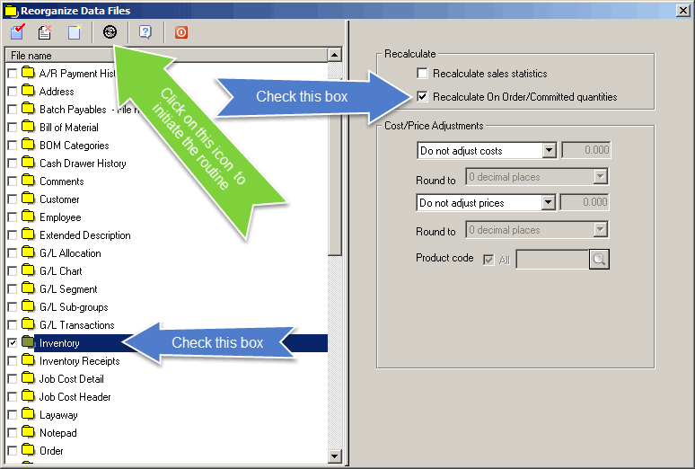 - Select Inventory; select Recalculate On Order/Committed quantities; click on the Reorganize icon. The routine will take from a few seconds to 15 minutes depending on the size of your inventory file and the speed of your computer and server.